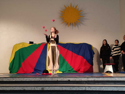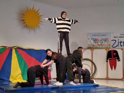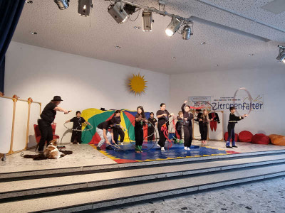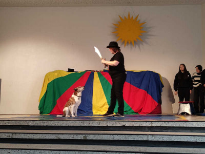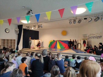 Am Donnerstag, dem 30.11.2023 durften die dritten und vierten Klassen eine bezaubernde Zirkusaufführung in der Aula erleben! Ines Rosemann vom Zirkus Seifenblase hat zusammen mit der Gemeinde, vertreten durch Silke Gherbi-Opel vom Bürgerhaus, und der Flüchtlingshilfe, vertreten von Detlef Bollmann, in den Sommerferien ein Zirkusprojekt mit Kindern aus Wardenburg und Hundsmühlen durchgeführt. Seitdem trifft sich die Gruppe regelmäßig und erarbeitete gemeinsam die Zirkusgeschichte „Lillys Circus“. Lilly ist ein Hund, der auf einem Bauernhof lebt und davon träumt, einen eigenen Zirkus zu eröffnen. Die Kinder zeigten in der Vorstellung ihr artistisches Können bim Bau von Pyramiden und im Umgang mit unterschiedlichsten Jongliermaterialien. Unterstützt wurden sie von einer Solokünstlerin sowie Ines Rosemann mit ihrem Zirkushund.
