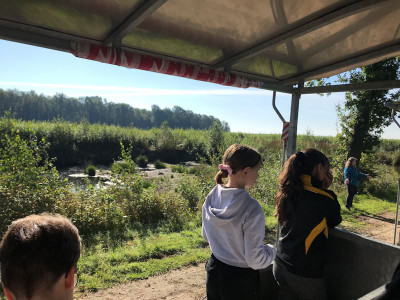 Danach ging es los mit der Moorbahn. Während der Fahrt konnten wir erleben, wie ein noch lebendiges Moor aussieht. Stille Wasserflächen mit abgestorbenen Baumstümpfen, Heideflächen und Röhricht erinnerten sofort an das Gedicht „Oh, schaurig ist‘s über Moor zu gehen“, welches im Deutschunterricht gerade gelernt worden war. Unterwegs gab es immer wieder Haltepunkte, an denen Carola, die uns den ganzen Tag über begleitete, das Moor näher brachte. Wir konnten Torfmoos auspressen und erleben, wie es Wasser speichern kann, lernten, dass die Kreuzotter und Schlingnatter sich sehr ähnlich sehen und nur an den Pupillen zu unterscheiden sind, erfuhren etwas über Wollgras und Sonnentau. Höhepunkt der Moorbahnfahrt war das Besteigen eines Torfberges, von dem wir einen Überblick über die weite Landschaft hatten.