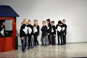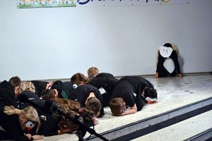 Zum Schluss watschelten und hüpften alle 57 Pinguine noch einmal zu dem Lied „Hinter Neuseeland, fast schon am Südpol, da lebt ein kleiner Pinguin.“ auf die Bühne. Begeistert klatschte das Publikum mit.