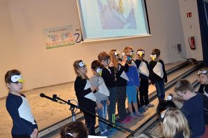 8. Juni 2018, 17.45 Uhr. Langsam füllte sich die Aula. Aufgeregte Kinder der Klasse 2a wuselten umher. Endlich war es soweit. Das Konzert „Lieder über Leute“ sollte gleich beginnen. Wochenlang hatte sich die Klasse mit ihrer Klassenlehrerin Frau Laue auf diesen Abend vorbereitet. Sie haben immer wieder geprobt, erst im Klassenraum, dann auch in der Aula. Denn es wurde bei diesem Konzert nicht nur gesungen, sondern einige Kinder schlüpften auch in andere Rollen. Da gab es den Bruder Jakob, der nicht aufstehen wollte und erst mit gesanglicher Hilfe des Publikums geweckt werden konnte, Auch bei anderen Liedern wie „Tante aus Marrokko“ oder „Kopf und Schulter“ animierte die Klasse 2a das Publikum zum Mitmachen.