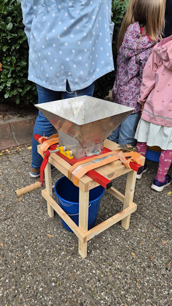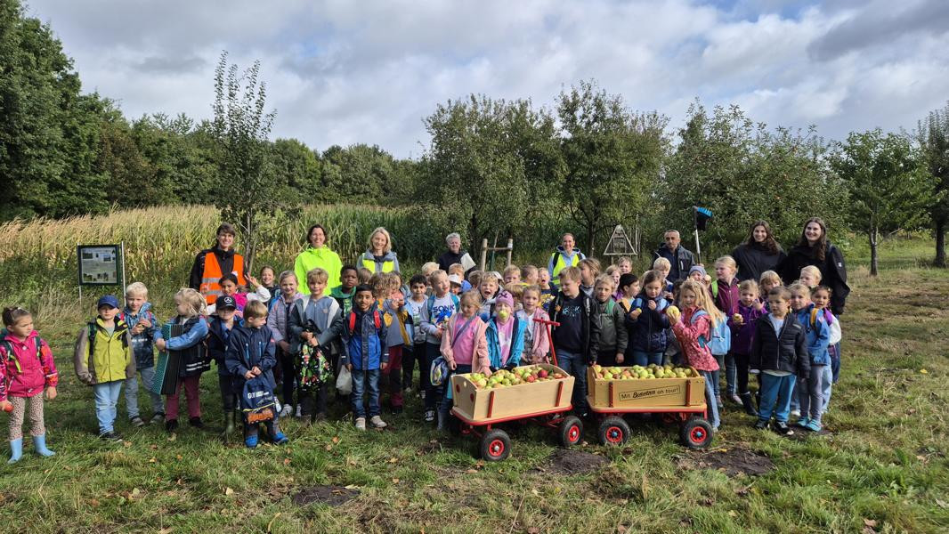 Der 1. Jahrgang hat im Fach Sachunterricht das Thema „Apfel“ bearbeitet. Im Rahmen der Einheit haben die Kinder verschiedene Apfelsorten probiert, Äpfel untersucht und gemalt oder dazu gebastelt. Wir sind gemeinsam zur Apfelwiese des Bürgervereins gelaufen, haben dort gepicknickt und zwei Bollerwagen voll Äpfel gesammelt. Aus diesen Äpfeln konnten wir mit einem Kaltentsafter Apfelsaft herstellen. Weiterhin wurde uns von einem Großvater eine 80 Jahre alte Apfelpresse vorgestellt und alle Kinder durften mit dieser Presse arbeiten. Eine Mutter hat zusätzlich noch Apfelkuchen gebacken und Pfannkuchen mit Apfelmus mitgebracht. Vielen Dank für die vielfältige Unterstützung!