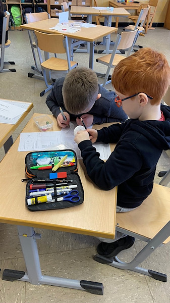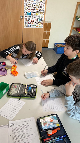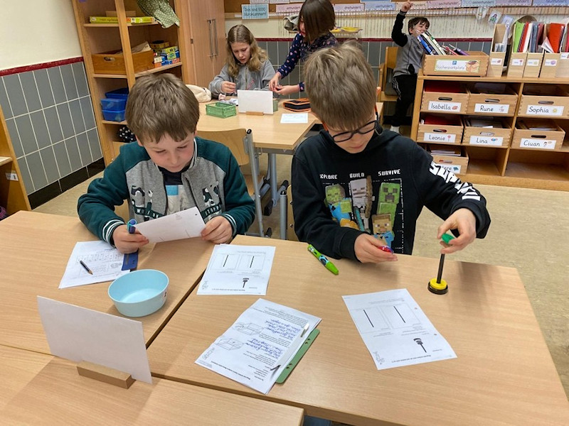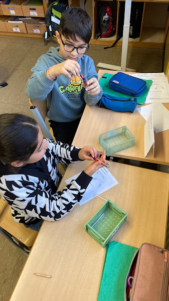 Außerdem untersuchten die Schülerinnen und Schüler, welche Materialien von Magneten angezogen werden. Unterschiedliche Gegenstände, Metallplättchen und sogar Münzen wurden getestet. Besonders spannend war es, selbst einen Magneten mit einer Büroklammer herzustellen oder eine „Büroklammer-Rettung“ durchzuführen – dabei merkten die Kinder, dass Magnetkraft sogar durch andere Materialien hindurch wirken kann.