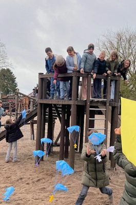 Anschließend forschten die Kinder an verschiedenen Stationen selbstständig weiter. Sie machten Luft sichtbar, untersuchten, dass Luft Platz braucht und sich ausdehnt, dass sie Druck ausübt, Kraft hat und sogar umgefüllt werden kann. Auch eine Taucherglocke wurde ausprobiert. Zum Abschluss wurden draußen Fallschirme und Papierflieger getestet – dabei konnten wir erleben, dass Luft bremst und auch trägt.