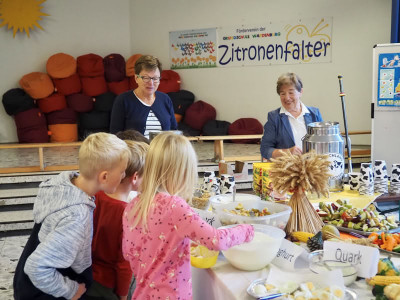 Ein reich gedeckter Tisch in einer herbstlich geschmückten Aula lud die Schülerinnen und Schüler der Grundschule Wardenburg am 28. September zum gemeinsamen Frühstück ein.