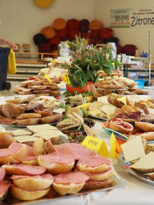 Die Brötchen wurden von den ansässigen Bäckereien (Behrens-Meyer, Bruno Tönjes und Strangmann) und der Musikschule Hoting gespendet, die Wurst von der Fleischerei Gnerlich und der Kakao von Edeka Stanke (beide Hundsmühlen). Alles andere haben die Schülerinnen und Schülern mitgebracht. Im Jahrgang 4 wurden die Brötchen geschmiert und mit Käse, Wurst oder Marmelade belegt. Der Jahrgang 3 bereitete das Gemüse, die Obstspieße und den Obstsalat zu. Müsli, Quark, Jogurt, Eier und Käsespieße wurden vom Jahrgang 2 zubereitet. Der Jahrgang 1 war zuständig für die Dekoration in der Aula.