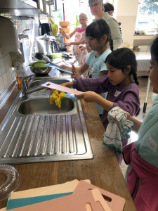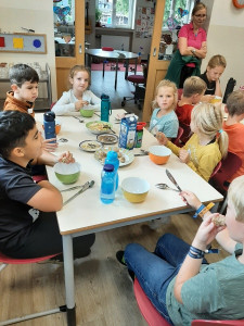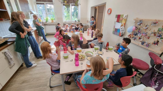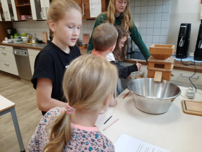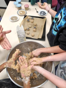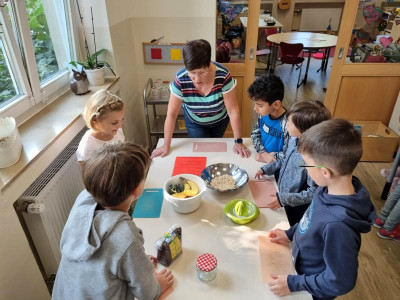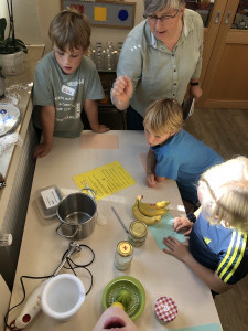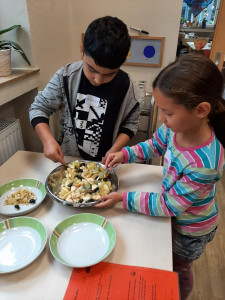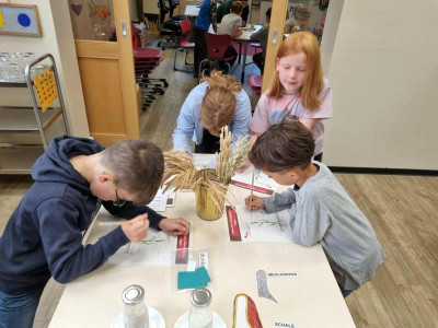 An verschiedenen Stationen konnten die Kinder Getreide untersuchen, dreschen, mit der Mühle und dem Stein mahlen, Haferflocken pressen und und und. Anschließend haben sie ein „5 Sterne Luxusfrühstück“ zubereitet: Aus Vollkornmehl wurde ein Teig hergestellt, daraus wurden kleine Brötchen geformt, mit Sesam, Sonnenblumenkernen und Mohn verziert und gebacken. Zudem wurden ein Bananenfruchtaufstrich sowie ein Apfel-Zwiebel-Aufstrich hergestellt. Auch ein knackiges Vollkorn-Früchtemüsli durfte nicht fehlen!