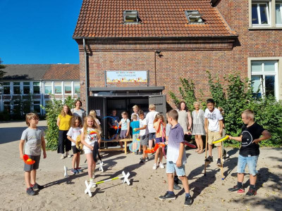 Der Förderverein „Zitronenfalter e.V.“ der Grundschule Wardenburg unterstützte finanziell und mit tatkräftiger Hilfe den Kauf eines Gartenhauses, welches auf dem Schulgelände aufgebaut und mit vielen verschiedenen Spielen ausgestattet worden ist. Die Mitarbeiterin Gabriele Knobbe hat mit der Konrektorin Hilke Büscher unter Rücksichtnahme auf Wünsche der Schülerinnen und Schüler Spiele für die Spieleausleihe ausgesucht und Kästen dafür bebildert und beschriftet. Weiterhin wurden Holzwäscheklammern und ein Schild für das Dach von unterschiedlichen Spendern gespendet. Jedes Kind an der Grundschule besitzt nun eine Holzwäscheklammer mit seinem Namen und kann damit in den großen Pausen Spiele ausleihen. Von der Letheschule wurden Holz-Steckenpferde gekauft, passend dazu werden Hürden und Pferdegeschirre gut angenommen. Besonders beliebt sind auch die Stelzen, ein Circle Jump (Schleuderspringseil) und Moon-Hopper (Hüpfbälle). Die Spieleausleihe wird ausschließlich von Dritt- und Viertklässlern geführt, die sich zum Pausenbeginn den Schlüssel für die Hütte abholen und alles vorbereiten. Am Ende der Pausen räumen sie selbstständig alles wieder weg und geben den Schlüssel wieder ab.