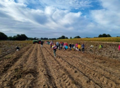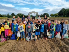 Nachdem die Beutel so gefüllt waren, dass einige Kinder sie nur noch hinter sich herschleifen konnten, bedankten wir uns herzlich bei Enno Dannemann für die spannende Erfahrung der Kartoffelernte. Nun gingen wir wieder zum Rand des Feldes und luden die gefüllten Stoffbeutel in einen Anhänger, so dass die Kartoffeln direkt zur Grundschule gefahren wurden. Wir liefen im Fußmarsch gutgelaunt und teilweise singend wieder zurück.