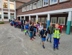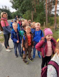 Um kurz nach 8:00 Uhr morgens ging es los. Alle drei Klassen stellten sich im Schulhof in einer langen Zweierreihe auf und etwa 60 Kinder, vier Lehrkräfte und ein Praktikant liefen los. Nach etwa 35 Minuten kamen wir am Feld an, wo uns Herr Dannemann bereits erwartete.