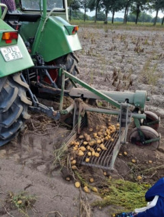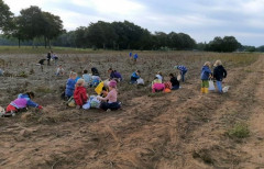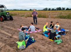 Zunächst legten wir eine Picknickpause ein. Die Kinder kramten ihre Sitzunterlagen und Picknickdecken hervor und wir setzten uns an den Rand des Feldes um zu frühstücken. Das Wetter meinte es gut mit uns und trotz der Regenschauer der vorangegangenen Tage, war der Sandboden trocken.Nach der Stärkung ging es mitten auf das Feld, immer hinter Herrn Dannemann auf seinem Trecker her. Enno Dannemann holte die Kartoffeln für uns mit einem kleinen Kartoffelroder aus dem Boden, so dass die Kinder eifrig Kartoffeln in ihren Stoffbeuteln sammeln konnten. Einige Kinder buddelten auch selbst in der Nähe nach den Erdfrüchten. Auf der einen Seite fanden wir die gelbschalige Belana und auf der anderen die rotschalige Laura.