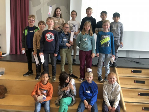 12 Schülerinnen und Schüler aus den vierten Klassen machten sich am 12.5.2025 auf den Weg an die GAG nach Oldenburg um zusammen mit Viertklässlern aus andern Grundschulen und Fünftklässlern von der GAG ein MINT-Training zu absolvieren.